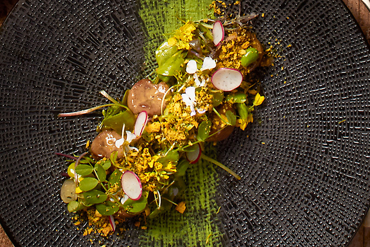 - Mit einem Pinsel einen Streifen Erbsenpüree auf den Teller ziehen.