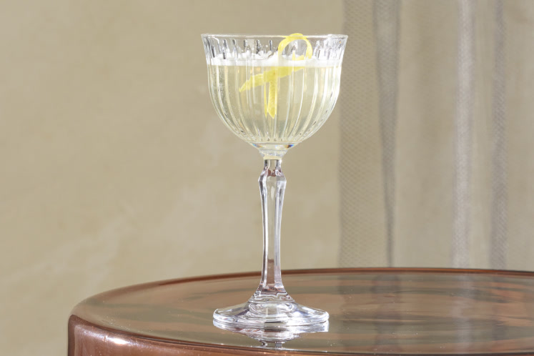 - Schenk uit de shaker met een behulp van een strainer uit over een met ijs voorgekoeld (Nick & Nora) glas.