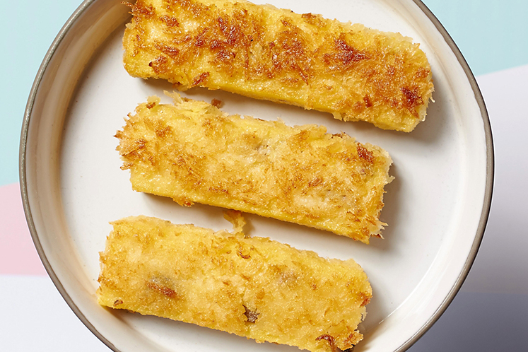 4. Laat de massa goed koud worden. Snijd op de gewenste grootte, haal door het eiwit en paneer daarna in de panko. Bak krokant in een pan met beetje olie.