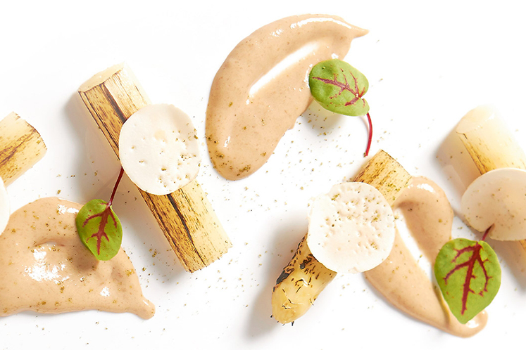 - Maak de asperges warm, karamelliseer ze lichtjes met een gasbrander en serveer met de mayonaise en dunne plakjes geschaafde champignons.