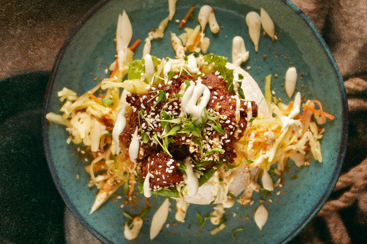 2. Besmeer een witte broodbol met beetje Sandwich delight en beleg met verse atjar en de kip. Garneer met gomaae no moto (sesampoeder) en limoen-koriandermayonaise.
