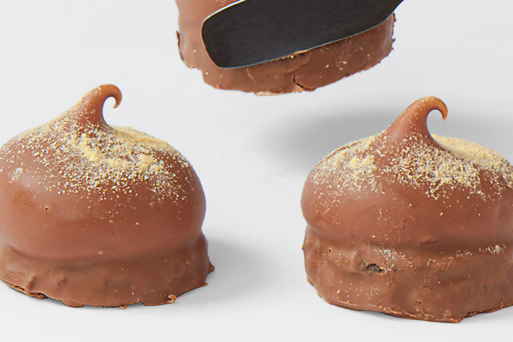 - Laat de mellow 30 minuten stevig worden en haal deze vervolgens door de melkchocolade (28°C).
