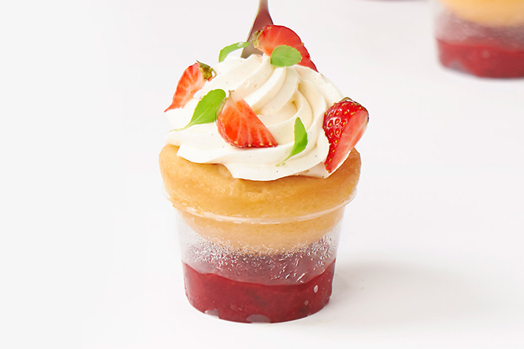1. Plaats de baba op een met compote gevuld potje en werk af met een rozet chantilly, verse aardbeien en verveine cress.