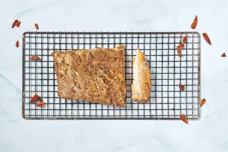 - Bereid het buikspek op bijvoorbeeld een Kamado barbecue met convector op 200°C voor circa 2 uur, tot een kerntemperatuur van 70°C. Gebruik een lekbak om het vet op te vangen.