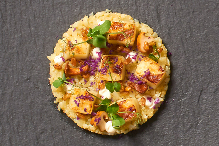 - Bak de bloemkoolcouscous kort in de beurre noisette. Gril de haloemie in een grillpan. Plaats de bloemkoolcouscous in een ronde steker op het bord. Snijd de haloemie en leg op de bloemkoolcouscous.