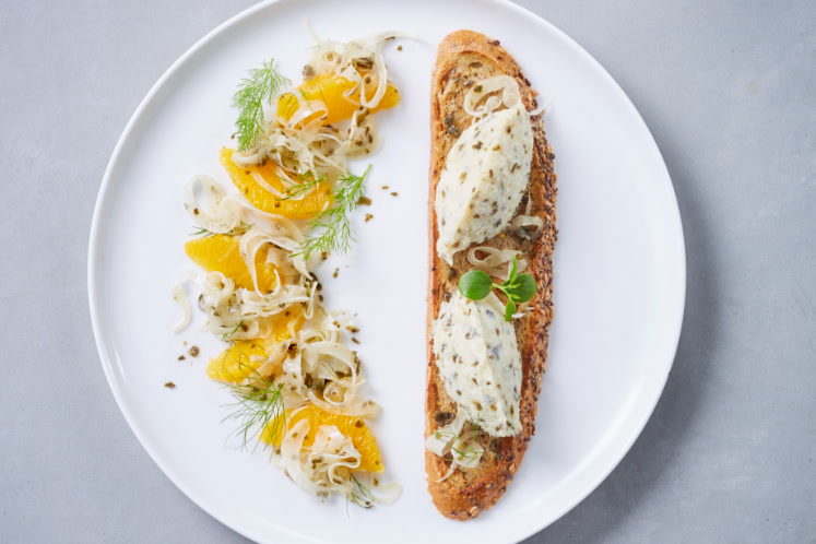 10. Maak een quenelle van de brandade en serveer op een sneetje toast met de venkel-sinaasappelsalade aan de zijkant.