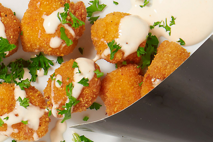 - Frituur daarna in olie. , Serveer deze ‘nuggets’ met een sausje van mayonaise vermengd met yoghurt en een paar druppels tabasco.