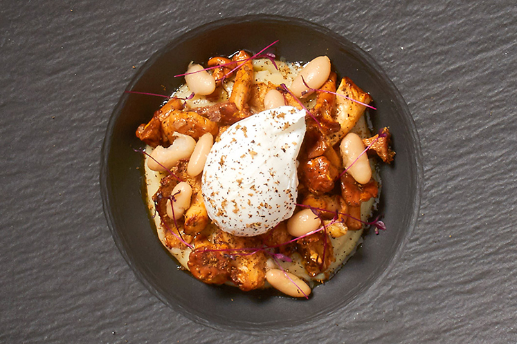 - Verhit de puree van topinamboer en leg deze in een diep bord.