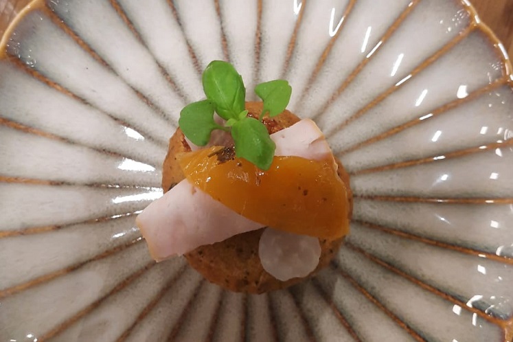 Bara met muhammara, gerookte kip en paprika.Dit recept wordt gepresenteerd tijdens de Chef's Table streetfood snacks tijdens het Horeca Event bij HANOS Apeldoorn op 26 september 2023.
