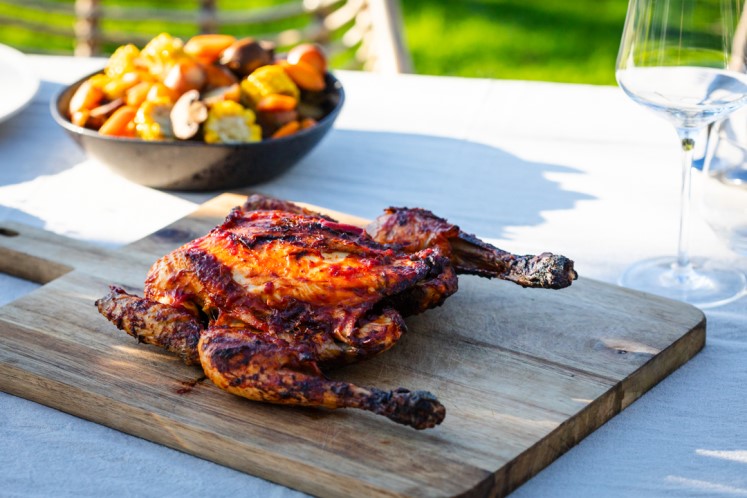 Chicken piri piri gevlinderd, met groente en aardappelgarnituur van de Braaimaster.De hele kip wordt gevlinderd, royaal ingesmeerd met piri piri-saus en langzaam gegaard op de Braaimaster tot een sappig en kruidig resultaat. Het bijgerecht van krieltjes, champignons, bospeen en mais wordt in de wok bereid boven het vuur. Recept voor 4 personen.Benodigdheden
