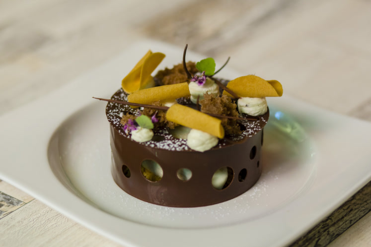 Vanille roomijs met crumble, chantilly, tuilles, chocoladesaus en een chocolade spongecake.Benodigdheden