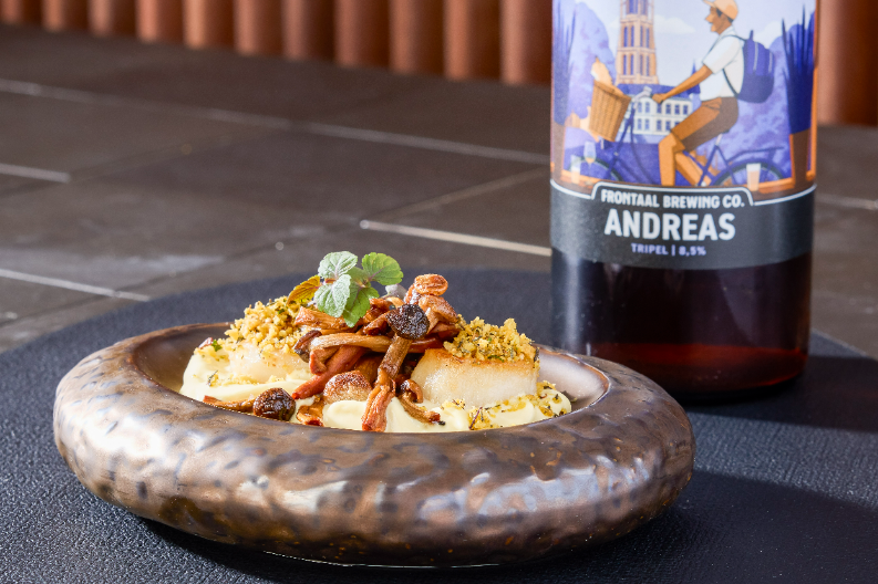 Gepekelde coquille met rijstmeel, beukenzwam in beurre noisette en hollandaisesaus. Afgetopt met crumble van honing en tijm.Benodigdheden