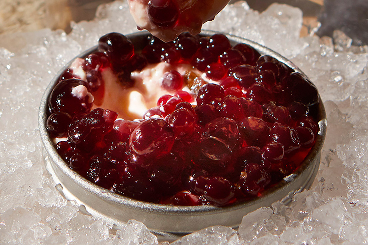 We combineren crème van Pierre Robert met een kaviaar van rode port.