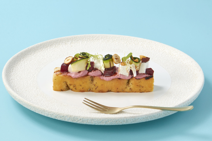 Crostini met hummus, rode biet, gegrilde courgette en geitenkaas