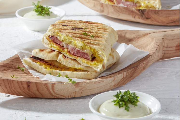 - Leg er twee plakjes gebakken ham en twee plakken varkensnek op.