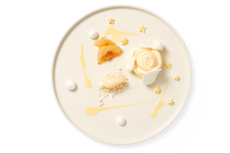 - Maak als laatste een quenelle van de citroensorbet en leg deze in het midden op het poeder van witte chocolade.