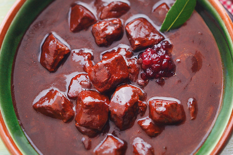 - Zeef de ragout tot een saus en voeg de veenbessen en de mosterd toe en laat 15 minuten koken. Mocht het nodig zijn, voeg wat maïzena toe als bindmiddel.