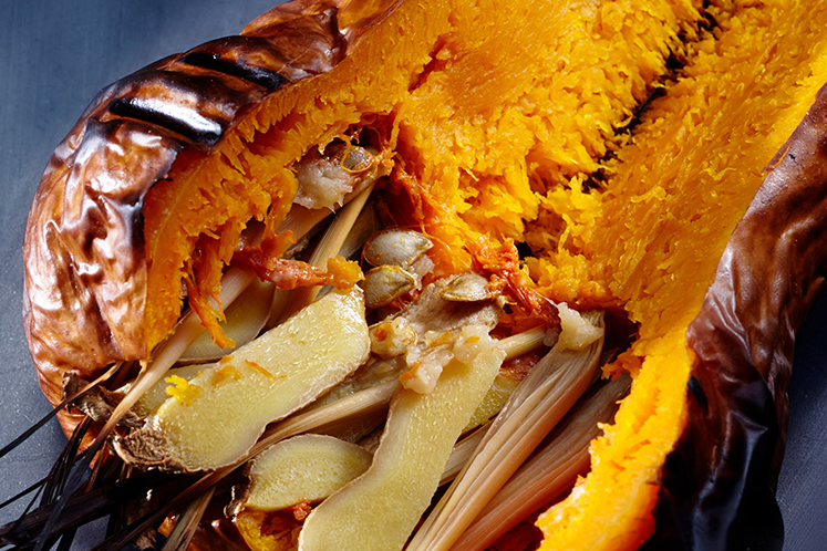 - Breng de binnenkant op smaak met peper, zout en olijfolie en vul de pompoen met gember en citroengras.
