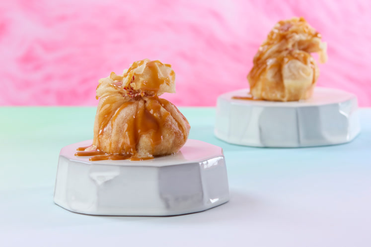 Kort en snel gefrituurd ijs, voor een krokante buitenkant en een ijzige binnenkant.Een scoop vanille-roomijs gepaneerd in een mix van verkruimelde cake en gezouten karamelcrumble. Vervolgens gewikkeld in een brickdeegvel bestrooid met kaneelsuiker, afgebonden en goed bevroren voordat het kort en snel gefrituurd wordt voor een krokante buitenkant en een ijzige binnenkant. Geserveerd met een royale hoeveelheid gezouten karameltopping.