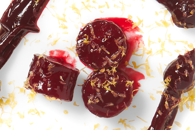 - Glaceer de bietjes in de kalfsjus, haal eruit en rasp er de ingelegde citroen over.