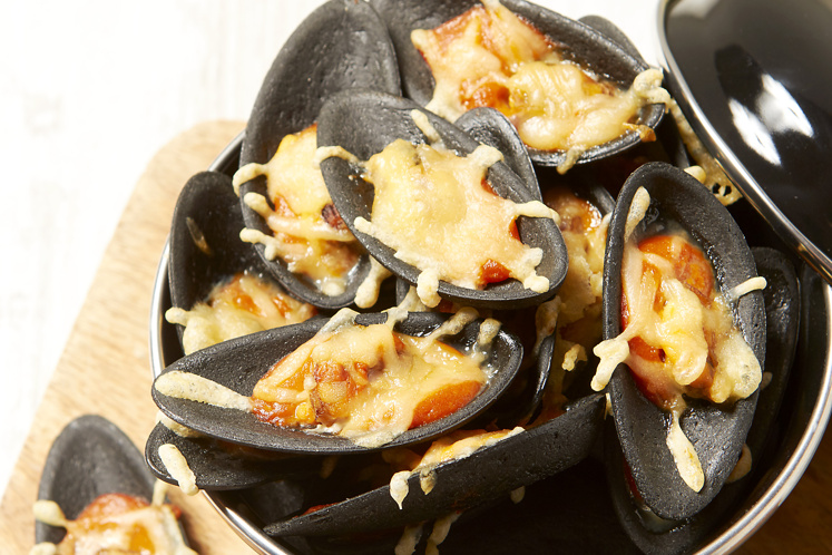Gegratineerde mosselen in eetbare schelp