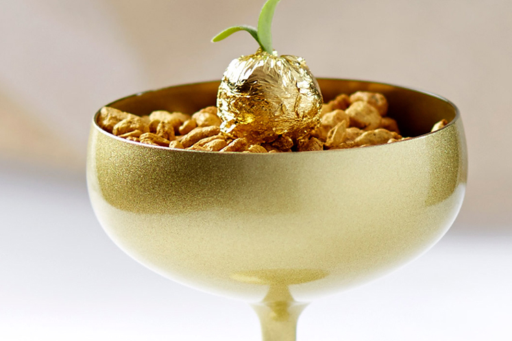 - Serveer de bonbon op gouden graantjes: meng een beetje gouden poederkleurstof door de gepofte kamut heen.