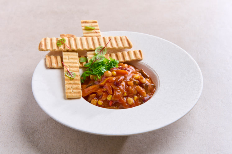 - Voeg de kikkererwten, maïskorrels, witte bonen, rode kidneybonen en gemengde paprikareepjes toe en verhit door.