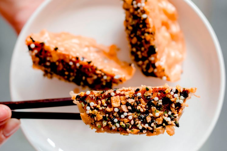 5. Dip de platte onderzijde van gyoza na bereiding eerst in saus en vervolgens in de crunchmix.