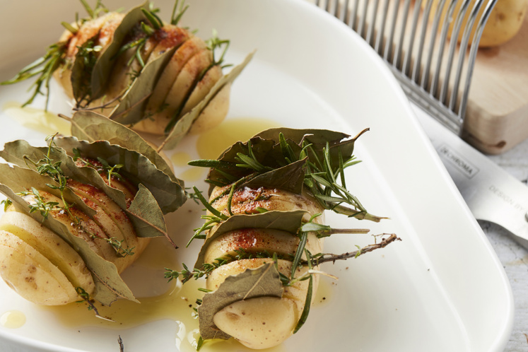 - Vul de inkepingen van de aardappelen afwisselend met blaadjes laurier en takjes van tijm en rozemarijn.