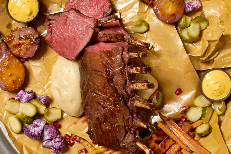 Hertenrack en sous-vide gegaarde groenten voor een gezellig sharing diner.