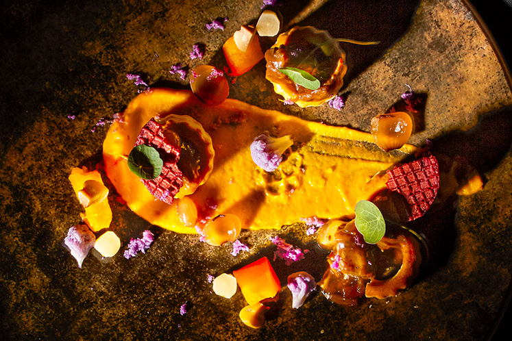 Wij maakten een aantal eigentijdse variaties van pastei. Bijvoorbeeld deze met hertenwang, puree van pompoen en geraspte paarse bloemkool.