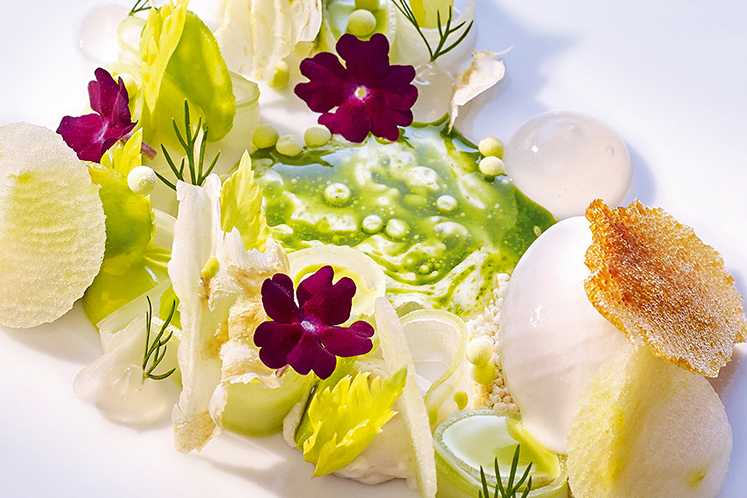Een gerecht door Thomas Bühner van La Vie*** in Osnabrück, gemaakt met tonkabonen, selderijmelk, citroenolie-room en dilleroom.
