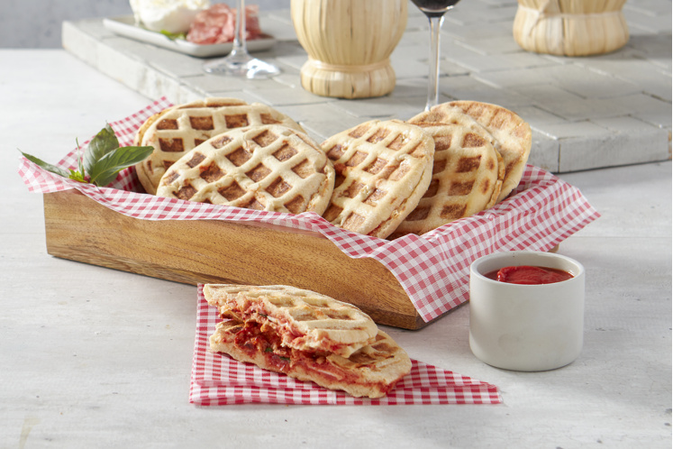 Een Fosette leent zich uitstekend voor het maken van een warmen sandwich, zoals deze ‘Italian waffle style sandwich’.De Fossette is een rond en plat wit broodje gemaakt op basis van tarwe, zuurdesem en olijfolie uit de eerste persing. Dit broodje leent zich uitstekend voor het maken van een warme sandwich. Wat dacht u van deze ‘Italian waffle style sandwich’? Besmeerd met gezeefde tomaat die op smaak gemaakt is met ansjovis, belegd met Spianata Romana, burrata en basilicum.Benodigdheden