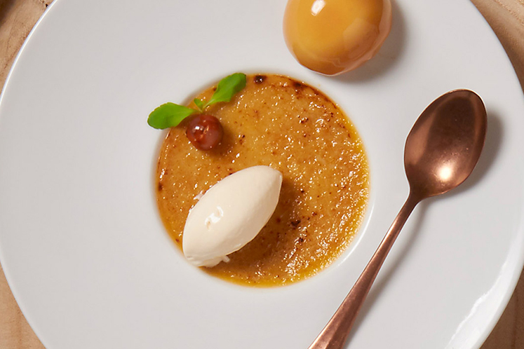 Dit dessert bestaat uit de volgende onderdelen: Crème brûlée met kastanje, Mousse van kastanje, Glaçage en Kastanje-ijsBenodigdheden