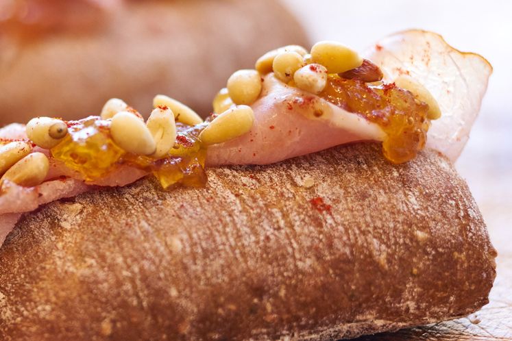 - Garneer met vijgencutney en een eetlepel geroosterde pijnboompitjes.