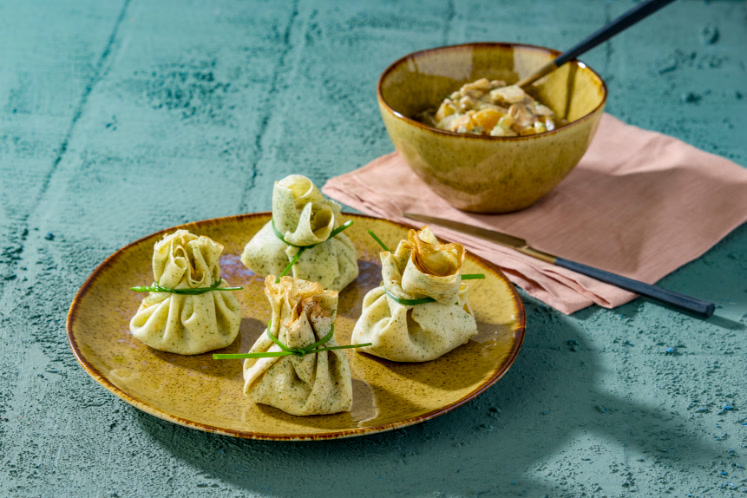 - Meng de paddenstoelen met de gebakken pompoen en de zure room.