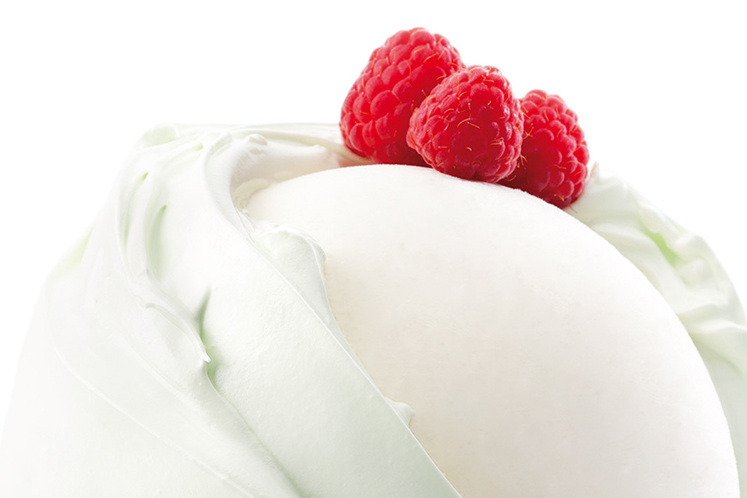 - Breng over in een spuitzak en vul de bombevormen voor de helft met de kwarkparfait, druk het interieur van frambozensorbet erin en vul verder af met de kwarkparfait.