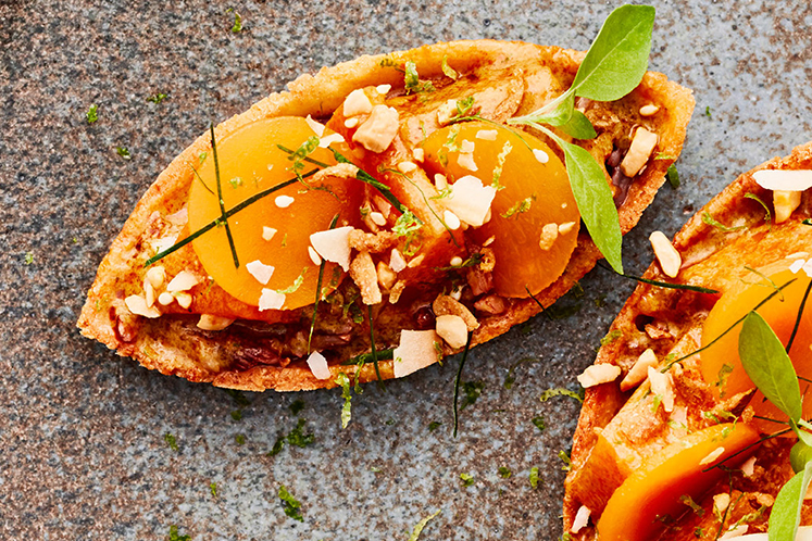 - Schep de rijst samen met de pompoen in de schuitjes. Verdeel het zoet zuur en de krokante topping over de laksa. Maak het geheel af met wat limoenrasp, limoenblad en wat takjes limoencress.