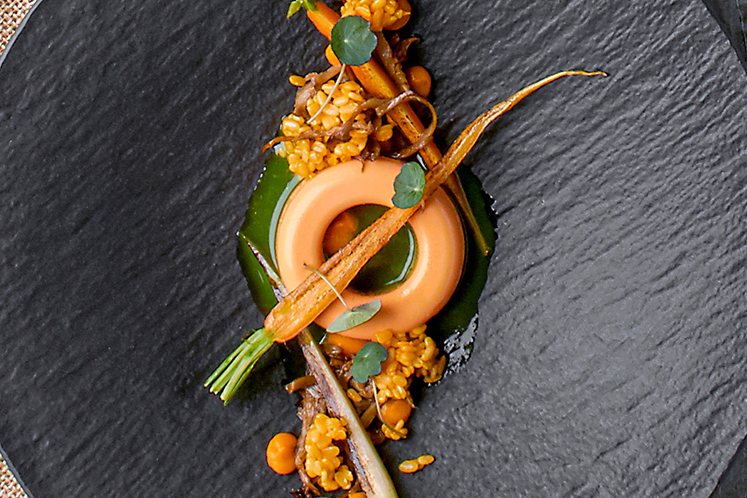 Dit gerecht bestaat uit een luchtige crèmeux van wortel en olijfolie, snijbonen, geroosterde minipeentjes en pulled kingboleet.Benodigdheden