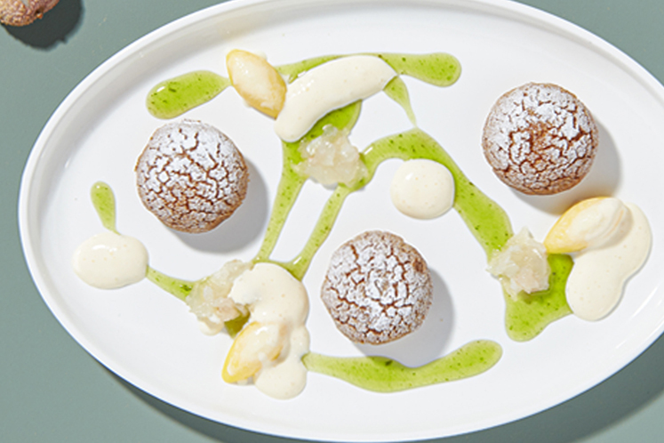 - Leg de soesjes op een bord en schenk de saus van pandan en basilicum er omheen.