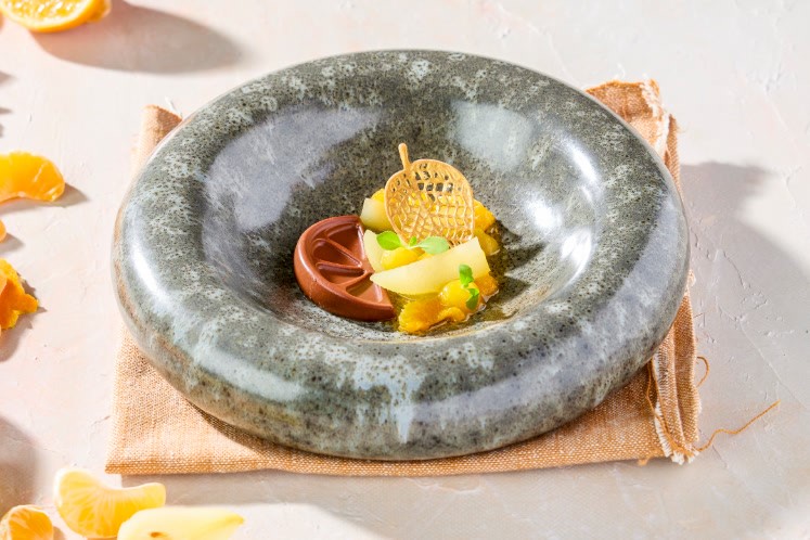 Cremeux van Guanaja chocolade en mandarijn, witte stoofpeertjes met zoethout en structuren van mandarijn.Benodigdheden