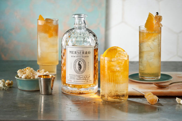 - Vul een longdrinkglas met ijs en schenk de Merser Double Barrel Rum in het glas.