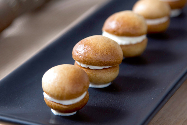 - Spuit een ganache naar keuze tussen de eierkoekjes.