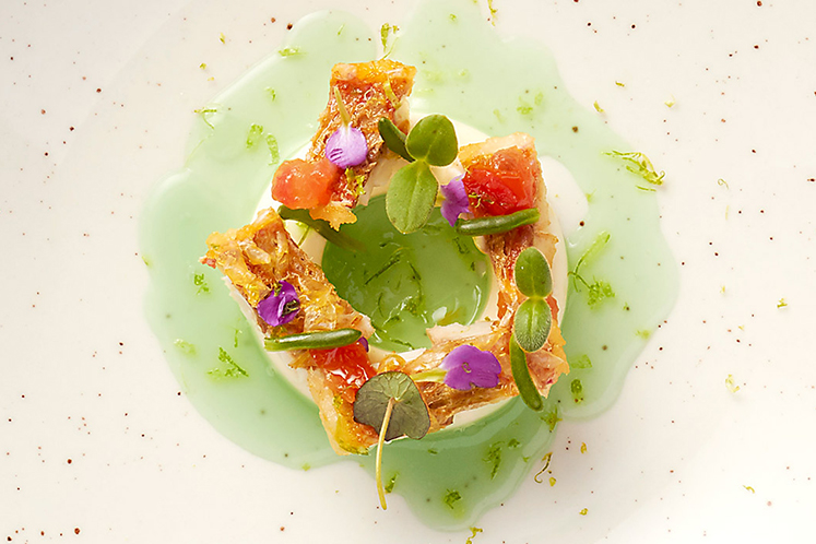 - Leg de palingmousse op een bord, daarop de krokante mul, gekonfijte tomaat en borage cress. Giet het sap van komkommer rondom de palingmousse en rasp er iets limoen over.