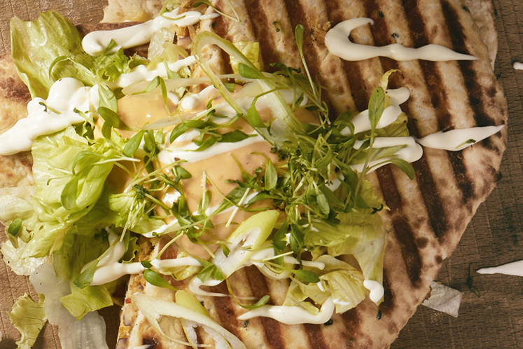 2. Snijd naanbrood in twee stukken, besmeer met de tandoori-yoghurtsaus en beleg royaal met pulled chicken en wat gesnipperde rode ui.