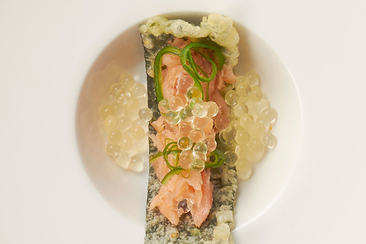 Onze adviseurs maakten een amuse van nori, gerookte zalm, wakame en yuzu.Benodigdheden