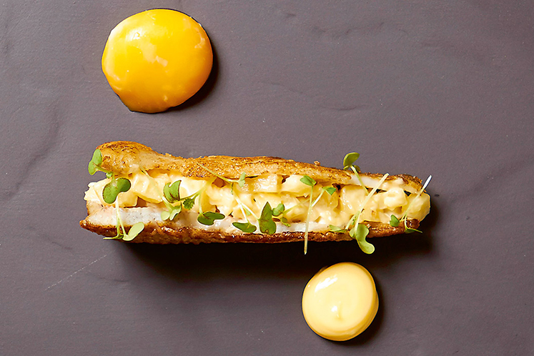 - Haal de filet van de bot en schep hier de gerookte aardappelsalade tussen en leg er weer een filet op.