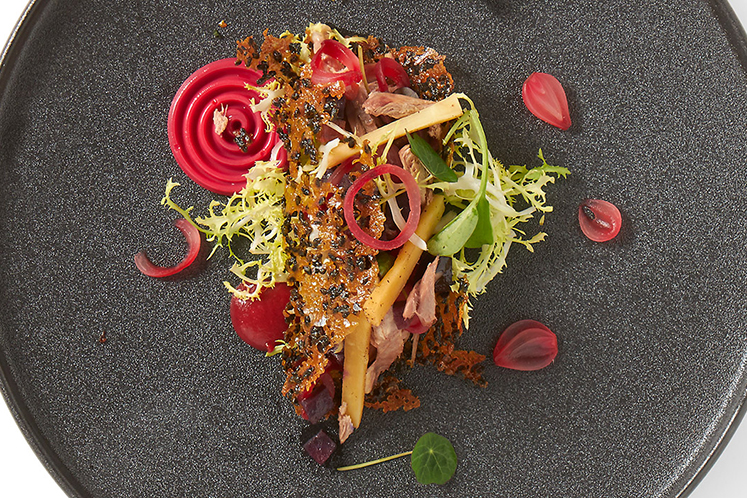- Vul de kletskop met de gekonfijte patrijzenbout, getrancheerde filet, rode biet en pastinaak.