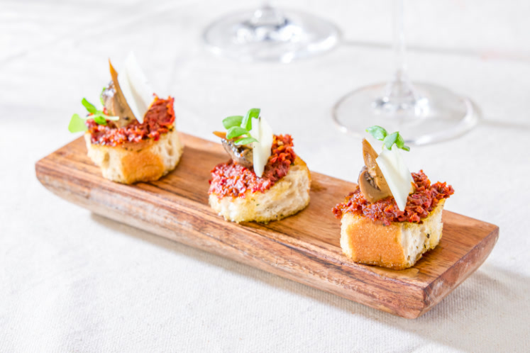 Crostini getopt met zontomaat, pecorino en champingons.Benodigdheden