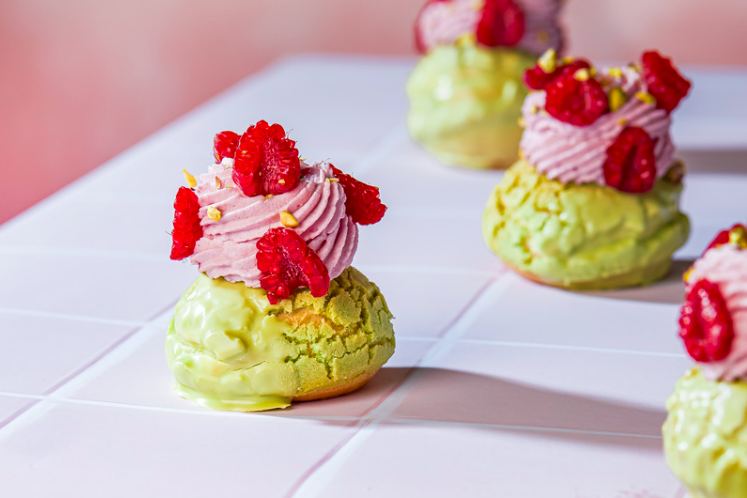 Craquelé soes, gedipt in fluweelzachte Souplesse Pistache, gevuld met frambozenbavarois en getopt met een sierlijke toef van dezelfde bavarois.Met frambozen en pistachenootjes zorgen voor een frisse, knapperige finish. Recept voor circa 30 soezen.